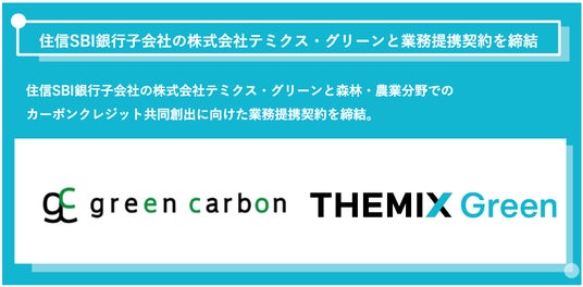 Green Carbon株式会社(本社:東京都港区、代表取締役:大北 潤、以下「Green Carbon」(読み;グリーンカーボン))は、住信SBI銀行子会社の株式会社テミクス・グリーン(本社:東京都港区、代表取締役社長:高橋 巧、以下「THEMIX Green」)と、森林・農業分野でのカーボンクレジットの創出を共同で推進するため、業務提携契約を締結したことをお知らせいたします。