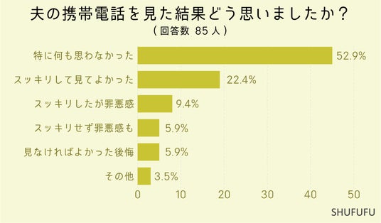 夫の携帯電話を見た結果どう思いましたか?を尋ねたところ、1位は「特に何も思わなかった(27%)」、2位「スッキリして見てよかった(9.5%)」となりました。罪悪感を感じた人は「7%」、後悔した人は「2.5%」で少数派のようです。