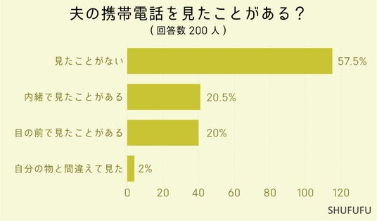 夫の携帯電話を見たことがある?の問いに対して最も多かったのが「見たことがない(57.5%)」でした。 次いで「内緒で見たことがある(20.5%)」「目の前で見たことがある(20%)」という結果でした。