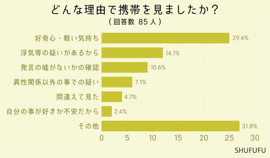 どんな理由で携帯を見ましたか?に関しては1位「好奇心・軽い気持ち(29.4%)」でした。2位は「浮気等の疑いがあるから(14.1%)」で、明確な疑いや目的を持って見た人より、なんとなく気になって見た人のほうが多いようです。