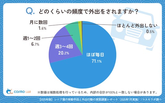 「ほぼ毎日」(71.1%)が圧倒的多数を占め、「週3~4回」(20.2%)、「週1~2回」(6.7%)と続きます。約7割のシニアが日常的に外出している結果は、従来のイメージを覆すほど活発な外出行動を示しています。