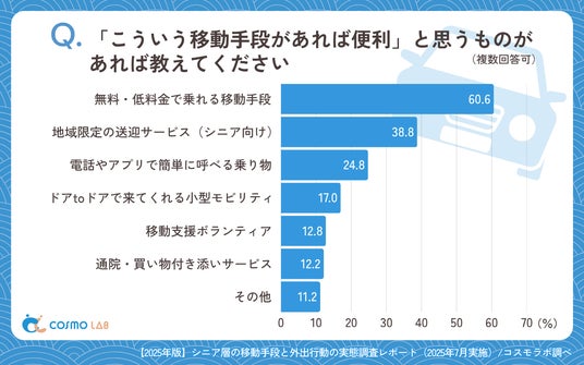 「無料・低料金で乗れる移動手段」(60.6%)が6割を超えトップで、「地域限定の送迎サービス(シニア向け)」(38.8%)や、「電話やアプリで簡単に呼べる乗り物」(24.8%)が続きます。