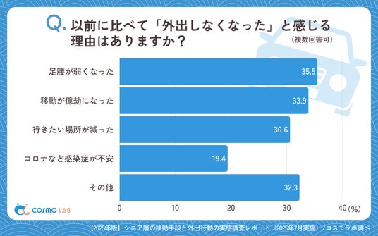 「足腰が弱くなった」(35.5%)や、「移動が億劫になった」(33.9%)、「行きたい場所が減った」(30.6%)が上位を占めています。外出頻度が減少した少数のシニアにおいては、身体的な変化が主な要因となっていることが明らかです。