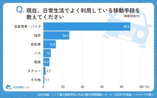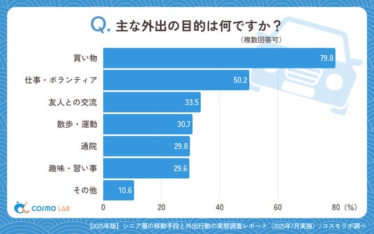 シニア専門のマーケティングプラットホーム コスモラボ(会社名:コスモヘルス株式会社、本社:東京都港区、代表取締役社長 小塚 崇史)がシニア層の『移動手段・外出行動』に関するアンケートリサーチのレポートをリリースしました。本レポートでは、50代以上のシニア層を対象とした移動手段や外出頻度に関する実態調査を実施しました。移動目的や手段、課題、支援ニーズなど多角的な観点から、シニア世代の移動行動の実情が明らかになりました。