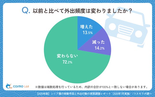 「変わらない」(72.2%)が7割を超え、「減った」(14.2%)、「増えた」(13.5%)はほぼ同程度となっています。外出頻度に大きな変化がないシニアが大多数を占める結果は、多くのシニアが安定した外出行動を維持していることを示しています。