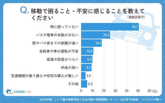 「特に困っていない」(50.7%)が最多ですが、「バスや電車の本数が少ない」(25.5%)や、「駅やバス停までの距離が遠い」(18.1%)といった公共交通機関への課題も一定数存在します。現状では移動に大きな不満を感じていないシニアが過半数いる一方で、4人に1人が公共交通の不便さを指摘している点は注目すべきです。