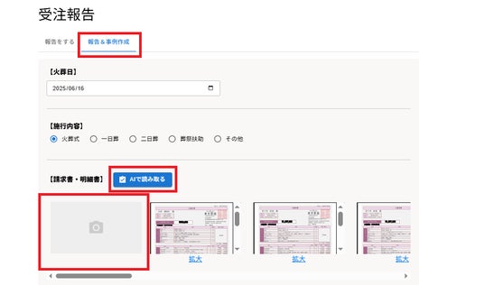 - 事例自動登録機能:請求書データから、葬儀の事例を自動作成