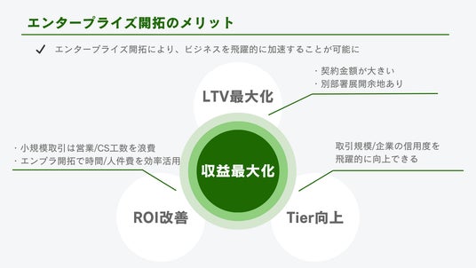 - 既存顧客対応に追われ、大手企業への新規開拓まで手が回らないリソースの大半が既存顧客のフォローに割かれ、限られた時間内でエンタープライズ向け営業を推進できない。