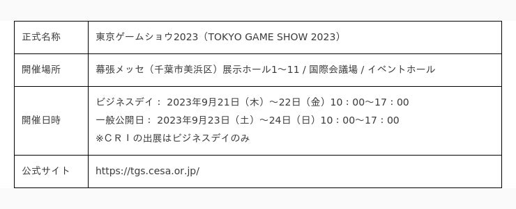 株式会社CRI・ミドルウェア(本社:東京都渋谷区、代表取締役社長:押見 正雄、以下「CRI」)は、2023年9月21日から幕張メッセで開催される東京ゲームショウ2023にて、ブース出展することをお知らせいたします。