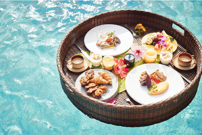 “浮かぶ朝食(Floating Breakfast)”を意味し、プールに浮かべた大きなトレーには、エッグベネディクトをはじめ、色鮮やかなフルーツ、スモークサーモンや旬野菜、アサイーボウル、自家製ペストリーやフレッシュジュース、淹れたてのコーヒーなどが並び、フォトジェニックで栄養満点なラインナップです。この朝食を楽しむために来島いただくゲストも数多い、当リゾート宿泊ゲスト限定にて提供する眼福なオファーで、エネルギッシュな一日のスタートを。