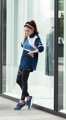 ZBELLEのカラーに合わせてネイビーでまとめたスタイリッシュなランニングコーディネートです。ネイビーベースのトップスとボトムスは、スウェーデンのコスメブランド「FACE STOCKHOLM(フェイス ストックホルム)とのコラボレーション商品です。コスメのカラーを意識したカラーリングやタイツの右足に描かれた大きなデルタマークがコーディネートのポイントです。