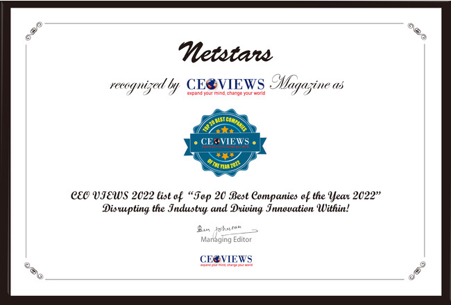 株式会社ネットスターズ(本社:東京都中央区、代表取締役社長兼CEO 李 剛、以下「ネットスターズ」)は、米国のテックビジネス誌『THE CEO VIEWS』が選定する「トップ20ベストカンパニー2022(Top 20 Best Companies of the Year 2022)」に選出されました。