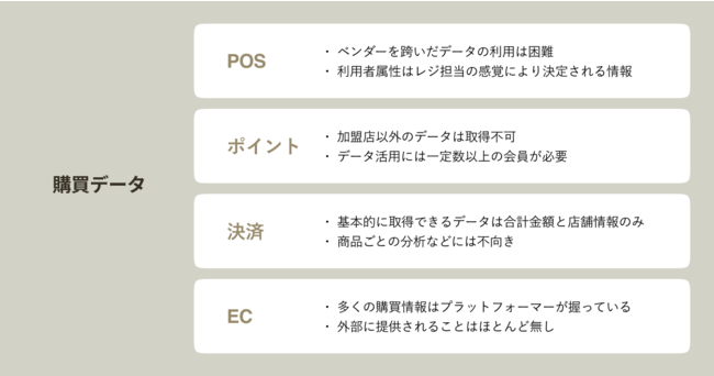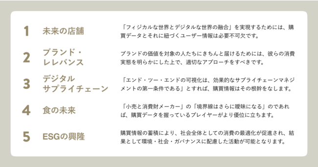 昨今世の中の購買データは、消費者関連市場の「未来の店舗」「ブランド・レレバンス」「デジタルサプライチェーン」「食の未来」「ESGの興隆」の5つのマクロトレンドにおいて、重要な役割を担っており、様々なビジネスシーン利用されています。(※)