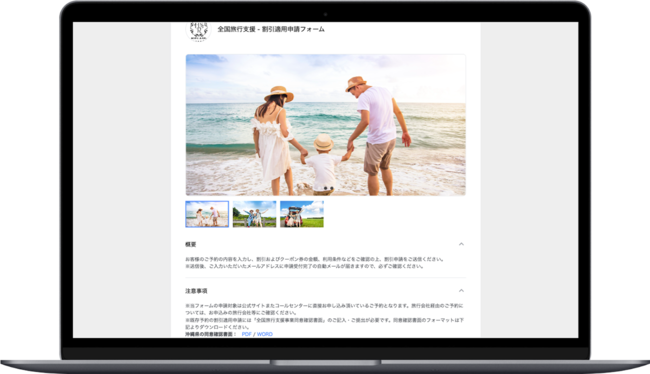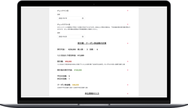 全国旅行支援は宿泊施設への直接申し込みに対応しており、本フォームで事前の申込手続きが完結します。申込後はお客様と宿泊施設の担当者双方に自動メールが送信され、管理画面で申込内容と同意書面の一元管理が可能です。