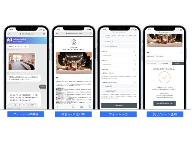 当社はこれまで地域割に関するお問い合わせについて、AIチャットボット及びFAQシステムを通じて、400施設ほどのホテル・旅館に対し、問い合わせ対応の効率化支援を行ってまいりました。今回の全国旅行支援は宿泊施設による申込も可能であることから、当社で提供している予約機能付き問合せフォーム『talkappi INQUIRY』を機能拡張し、今回の専用申込フォームの提供に至りました。