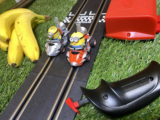 ミニオン カートレーシンングは全長約4.3メートルのコース。付属の橋脚をコースの下に装着すれば、立体交差のある8の字コースで遊ぶことができます。