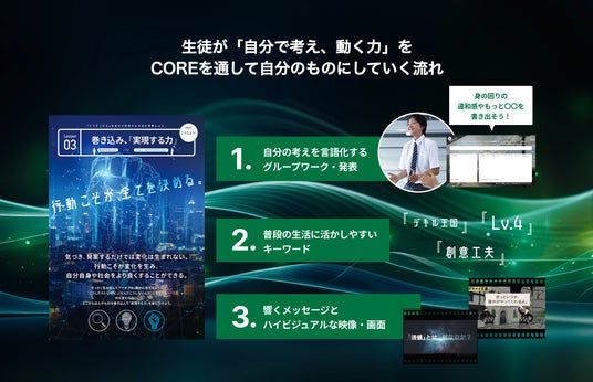 創造学園・全教研・早稲田スクール・学研スタディエ・イング・学研エルスタッフィングで「キャリア教育教材/CORE」「学習モチベート教材/BASE」を活用した新しい授業形式が令和6年より導入されます。