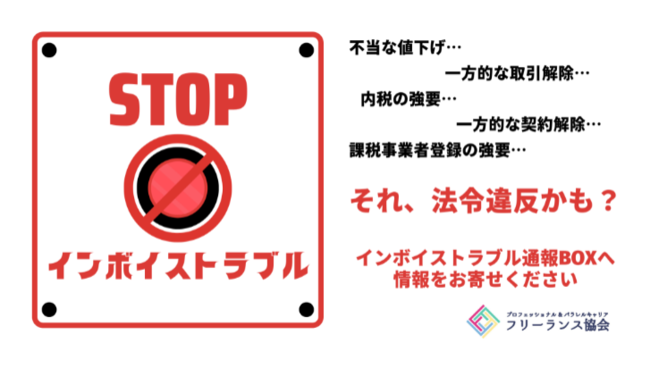 当協会では、インボイス制度対応を機に生じた発注者との契約トラブルについて実態を把握し、政府に対策を求めることを目的として、2022年12月22日に「インボイストラブル通報BOX」を開設しています。インボイス制度対応を機に発注者との契約トラブルが生じたフリーランスの方は、ぜひご通報ください。