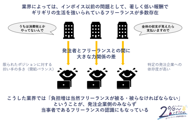 協力団体との意見交換や個別ヒアリング等によれば、出版・放送コンテンツ業界や文化芸術業界等の一部においては、限られた取引需要に対する担い手の多さから、発注企業とフリーランスとの間に著しい力関係の差があると同時に、特定の発注企業への依存度が高い傾向があります。そうした背景から価格交渉力に乏しく、著しく低い報酬でギリギリの生活を強いられているフリーランスが少なくありません。また、そうした業界では「負担増は当然フリーランスが被る・被らなければならない」ということが、発注企業側のみならず当事者であるフリーランスの認識にもなってしまっています。