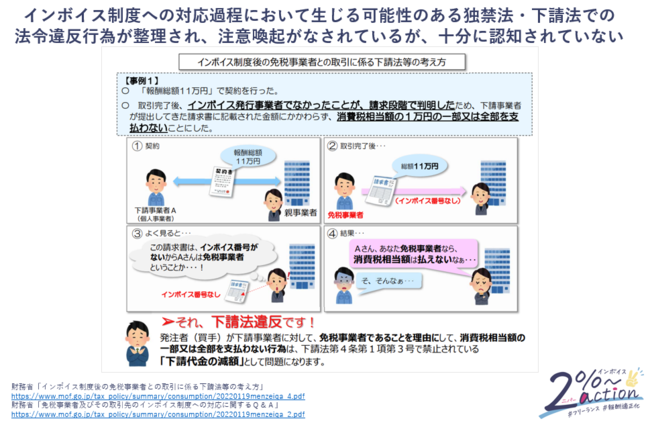 インボイス制度の施行によりフリーランスが不当に不利益を被ることを防ぐため、インボイス制度への対応過程において生じる可能性のある独禁法・下請法での法令違反行為が整理され、注意喚起がなされていますが、十分に認知されているとは言えません。