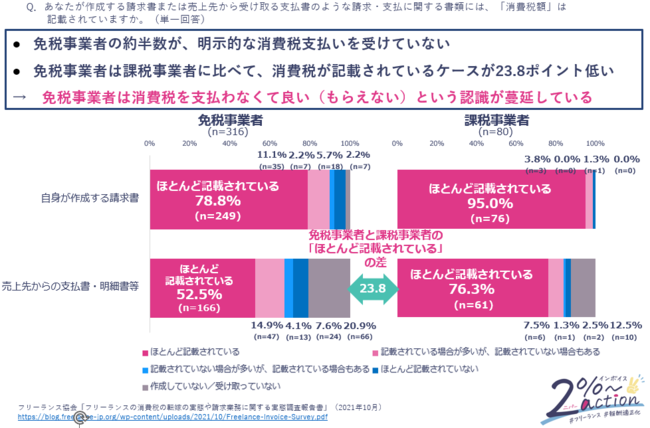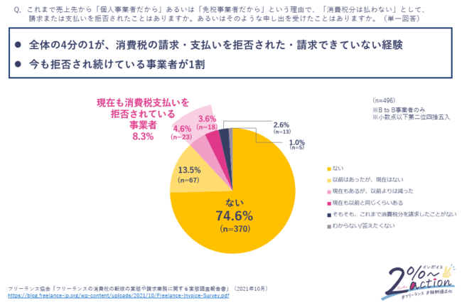 当協会が2021 年に実施した調査では、回答者の24.4%が、これまで売上先から「個人事業者だから」あるいは「免税事業者だから」という理由で消費税の支払いを拒否された経験や請求できていない状況がありました。