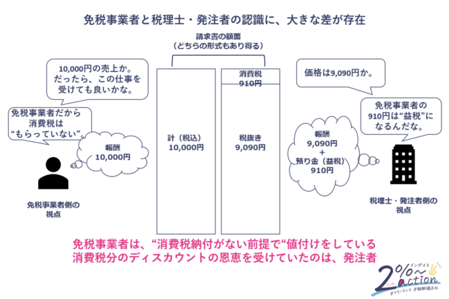 免税事業者は事業を営み、生活をしていく上で、「消費税納付の必要がない前提で」その仕事を引き受けるか否かの判断や値付けをしている人が多く、消費税分を”益税”と考える税理士や発注企業側の認識と大きな相違があります。税務リテラシーもさまざまであるため、中には自分は免税事業者だから”消費税をもらっていない”認識で値付けしてきた免税事業者も存在します。