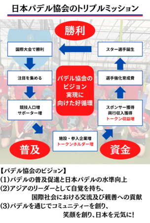 追加トークン販売の目的はアジア・アフリカ予選、および世界大会への参加、つまり「日本代表選手が世界に挑戦するための後押し」です。日本パデル協会では「勝利」「普及」「資金」のトリプルミッションを掲げています。