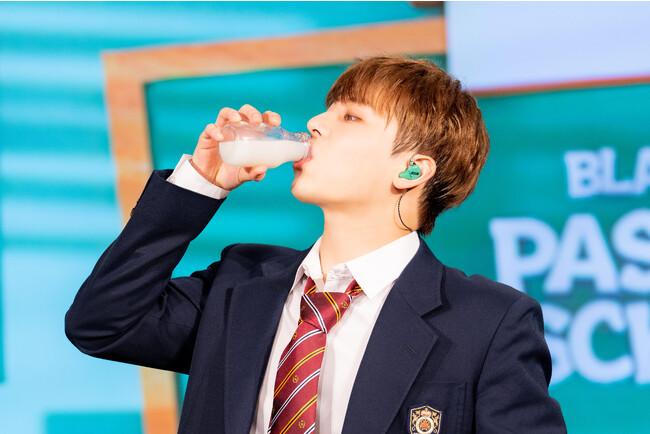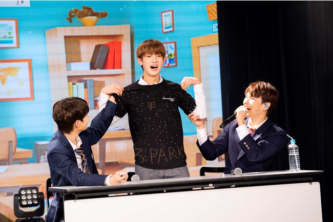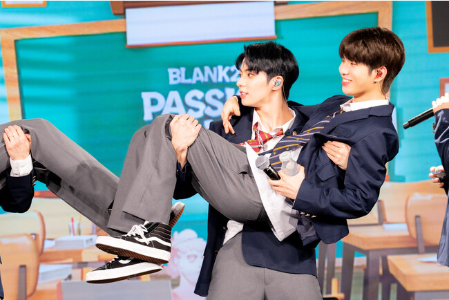 先生役を務める、MCのナナさんが「BLANK2Y Passion Schoolを開催します~!」という声を合図に、「俺がきたぞ~!」と元気よく制服姿で登場するルイを筆頭に、ノリノリでステップを刻みながら机に向かうドンヒョクなど…まるで男子校のように和気藹々と楽しむメンバーが登場。コロナ禍で観客の皆さんが声を出せなくても、しっかりとアイコンタクトなどで、コミュニケーションを取って満面の笑みをこぼすメンバーの姿が印象的でした。