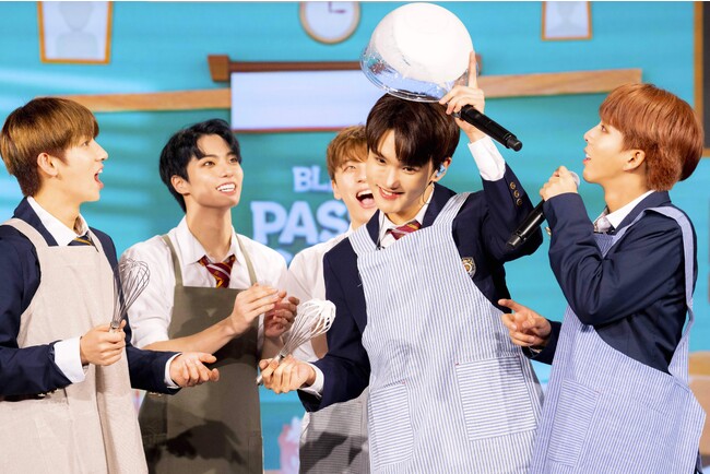 一方でステージ下手では、エプロンの掛け方がわからず、困り顔のUやソンジュンのお茶目な姿など、メンバー一人一人、個性あふれるシーンも。また、ソダムも一生懸命ホイップクリームづくりに挑戦してみるものの、末っ子だけの特権だぞ!と言わんばかりに、ヒョン(お兄さん)たちに甘える仕草を見せ、メンバー全員メロメロになって、助けてあげることも。