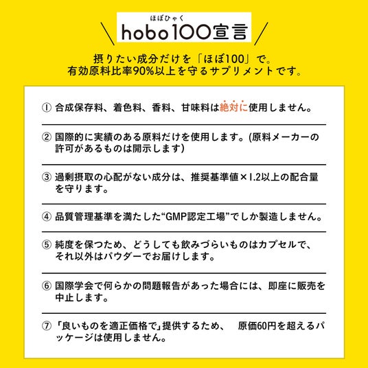 さまざまな成分を組み合わせ、ユーザーの悩みを解決するサプリメントがある一方で、hobo100シリーズは、高い実感力が期待できる原料を厳選し、合成保存料や着色料などを使用せず、限りなく100%に近い原料を純度高く届けることを約束します。