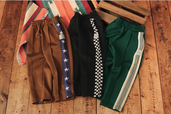 レトロ感のある柄のサイドラインがポイントの、トラッカーパンツ。