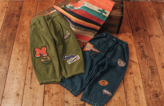 過去のBREEZE商品のワッペンを散りばめたパンツ。