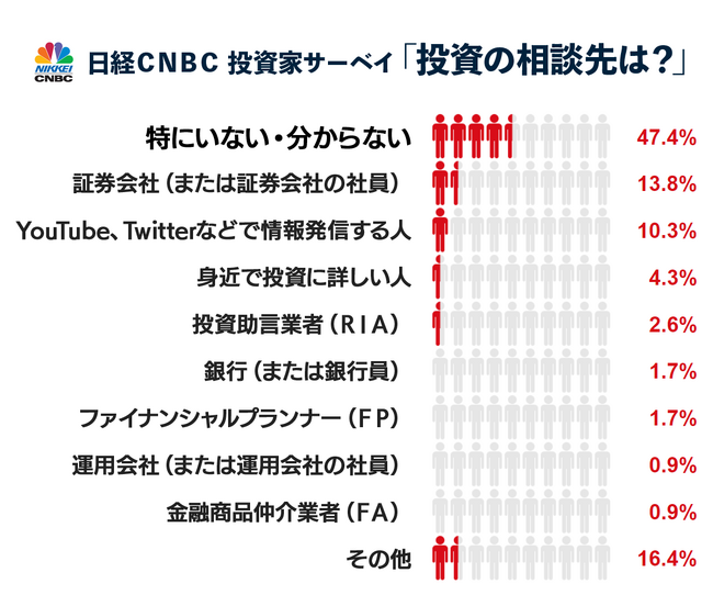 株式会社日経CNBC(本社:東京都千代田区、代表取締役社長:竹之内源市、以下「日経CNBC」)は7月5日、現役の投資家を対象に6月29日から7月3日までインターネットで実施した「投資や資産形成の相談相手」に関するアンケート結果を発表しました。結果は以下の通り。