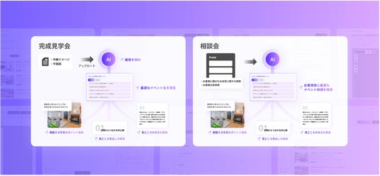 完成見学会と相談会、2種類のイベントページ作成をAIが提案します。手間に感じる方が多かったイベント名の入力や魅力を伝える文章を、AIが物件やお客様のイメージを分析し自動で提案してくれます。