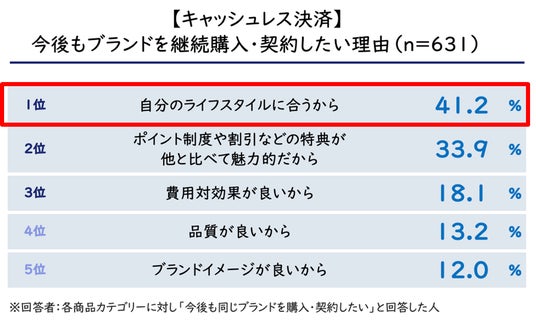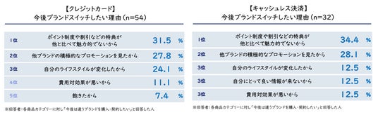前掲した設問【自身で選んで購入・契約している商品の、今後の継続意向】で上位2位を占めた「キャッシュレス決済」と「クレジットカード」は、いずれも「ポイント制度や割引などの特典が他と比べて魅力的でないから」「他ブランドの積極的なプロモーションを見たから」「自分のライフスタイルが変化したから」がTOP3に。