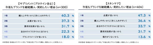 一方で「サプリメント(プロテイン含む)」と「スキンケア」は、「品質が良いから」と「購入しやすいから」が継続理由のTOP2となっていました。