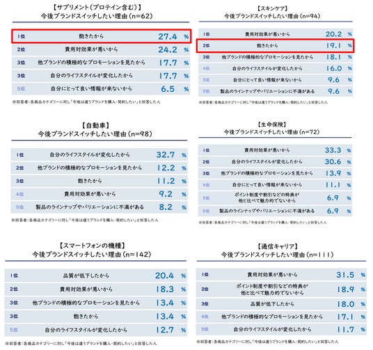 一方で、「サプリメント(プロテイン含む)」「スキンケア」は「飽きたから」がスイッチ理由として多い傾向にありました。