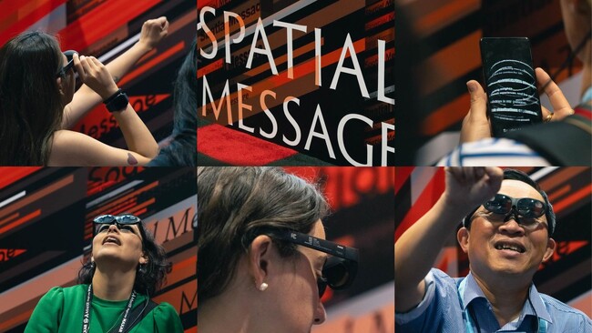 「Spatial Message」は、イベント等の特別な場において、ユーザ同士がイベントに関するメッセージを「AR(拡張現実感)技術」を活用して共有できる体験コンテンツです。AR技術が普及し、仮想空間と現実空間がシームレスにつながる「サイバーフィジカル空間」において可能になるコミュニケーション体験をXREALが提供するARグラスを用いて体験いただけます。