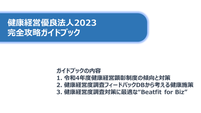 従業員の運動習慣化を実現する健康経営ソリューション「Beatfit for Biz」を提供する株式会社アリストル(本社:東京都渋谷区、代表取締役:宮崎 学、以下『当社』)は、令和4年度健康経営優良法人の申請が2022年8月22日に開始されたことを受け、健康経営優良法人の認定資格、および健康経営銘柄/ホワイト500/ブライト500の上位資格の取得を目指す企業様向けに、公開情報を基に当社独自の視点で令和4年度の健康経営度調査の傾向と対策をまとめた「健康経営優良法人2023完全攻略ガイドブック」を期間限定で無償公開したことをお知らせいたします。