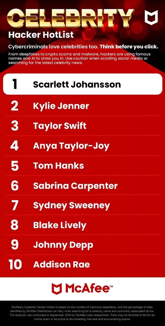 マカフィーの調査チームは、SNSインフルエンサーを含む、悪意のあるディープフェイク詐欺や、消費者が気づかないうちにマルウェアをインストールしたり、データ、プライバシー、アイデンティティを危険にさらす詐欺に遭う可能性のある危険な検索結果で、最も頻繁に名前や肖像が利用されている有名人を特定し、「2024年オンラインで検索すると危険なセレブTOP10」を作成しました。