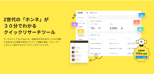 サークルアップは電通若者研究部が自らの研究ツールとして開発し、2022年6月に当社が事業売却を受けたクイックリサーチツール。約2万人の現役大学生が登録しており、100サンプルの調査が10~30分で完了するなど、そのスピード感が特徴で、多くの企業様のマーケティング活動やリクルーティング活動にご活用いただいています。