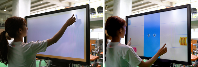 ランダムに点灯するターゲットを素早く捉え、正確に指でタッチする。眼と手と身体を協応させることで、総合的な適応力を向上させる。バスケットボール競技だけでなく、スポーツ全般で必要となる基礎能力を鍛えるトレーニング。
