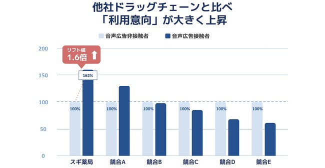 他社とスギ薬局それぞれに対する「利用したいか」という質問のスコアでは非接触者と比べて「利用意向」が60%以上上昇する結果となりました。
