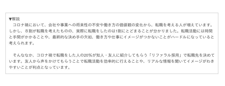 一方で、オンライン選考への移行などにより、転職を考えるもののきっかけやリアルな情報が足りていないことで一歩を踏み出さない人も多くなっております。そんな中リファラル採用で転職先を決めた人は2割おり、会社の中の人からリアルな情報を聞いて転職することでギャップも少なく、友人からのサポートでなじみやすいという声がありました。実際に、リファラル採用プラットフォーム「MyRefer」で紹介応募、採用決定している人の数は昨対比で200%に成長しています。MyReferは、今後も企業と個人の本質的なマッチングを支援し、つながりで日本のはたらくをアップデートしてまいります。