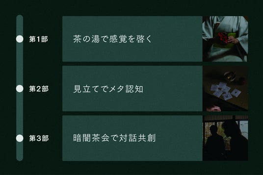 「忙しさに追われ、数字に縛られ、正解ばかりを求め続ける毎日。AIの台頭も相まって、現状に対する違和感や漠然とした不安を感じている。そして、これまでの論理的思考に偏ったアプローチや課題解決手法に、どこか限界を覚えている」──そんな現代のビジネスパーソンと組織に対して、日本古来から続く文化である茶の湯という「別解」を通じて、日常ではたどり着けない、深い対話共創の時間をつくります。