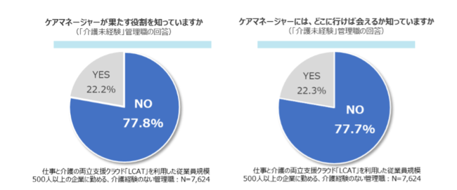 しかしながら、介護経験のない管理職の多くが、「相談されたときにどう回答していいか分からない」というのが実態のようです。 特に、ビジネスケアラーの両立に必須となる、「ケアマネージャー」の存在や役割について、理解できていない管理職が約8割という現状は、今の管理職の「ビジネスケアラー対応力不足」を浮き彫りにしています。