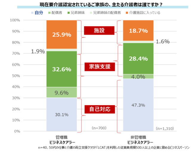 4.介護経験のある管理職(管理職ビジネスケアラー)は、約7割が「家族支援」か「施設対応」vs 非管理職ビジネスケアラーは約5割が「自己対応」