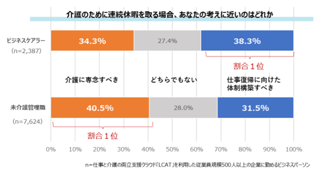 今回の調査でも、介護経験のない管理職は、「介護のために連続休暇を取るなら、(その間仕事に復帰する調整をするのではなく)介護に専念すべきである」と考えがちな実態が明らかになりました。