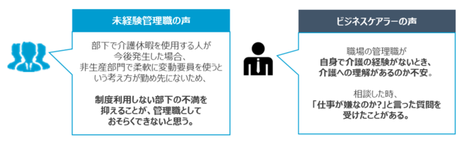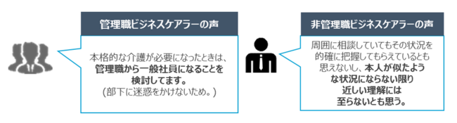 自己対応型でサバイバルしている管理職ケアラーが少ない中、部下の個別事情に応じた適切なケアラー対応ができるのか、ケアラー本人からも不安の声が上がっています。