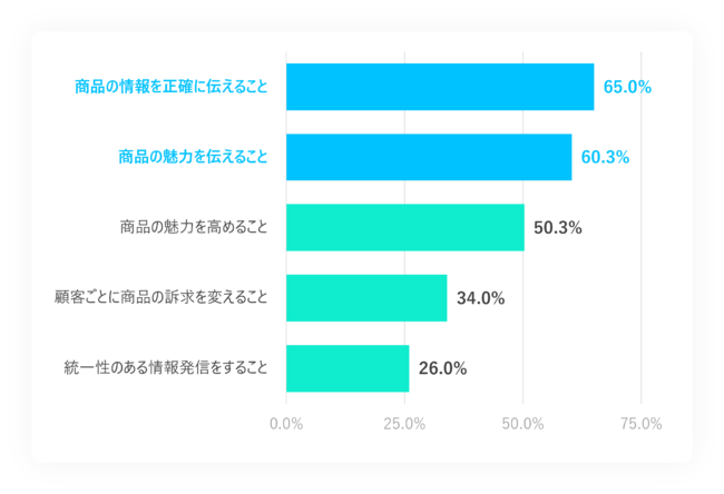 「商品情報を正確に伝える」65.0%が最多、次いで「商品の魅力を伝える」が60.3%